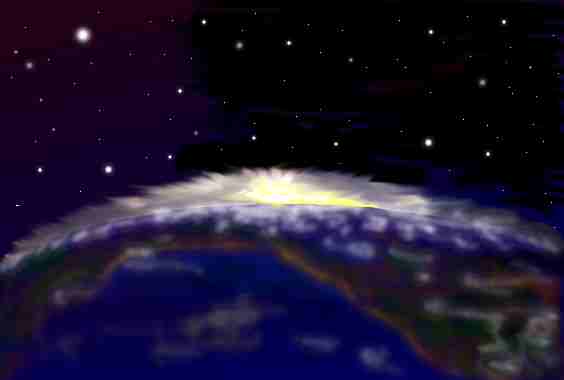 It was beginning to get lighter and lighter ahead of them. "We are about to see something that very few people have ever seen, including most astronauts" Papa announced. Just then, the sun appeared over the horizon. "Sunrise in the West!" Papa exclaimed. Because the Flying House was moving westward faster than the earth spins toward the east, they had caught up with and begun to overtake the sun. In fact, it looked as though it were rising faster than you would see it rise on any normal day.